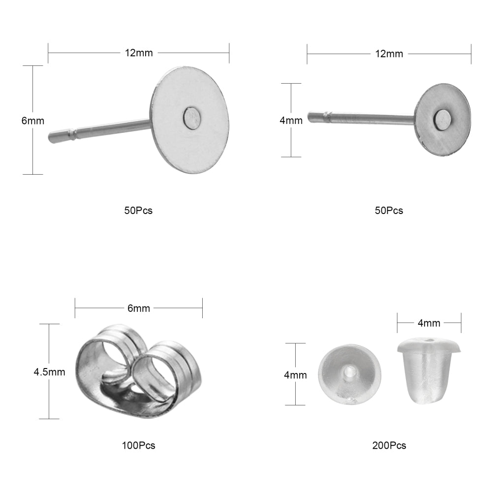 DIY Earring Making Kits, 100Pcs Stainless Steel Flat Round Blank Peg Stud Earring Findings, 200Pcs Stainless Steel & Plastic Ear Nuts, Stainless Steel Color