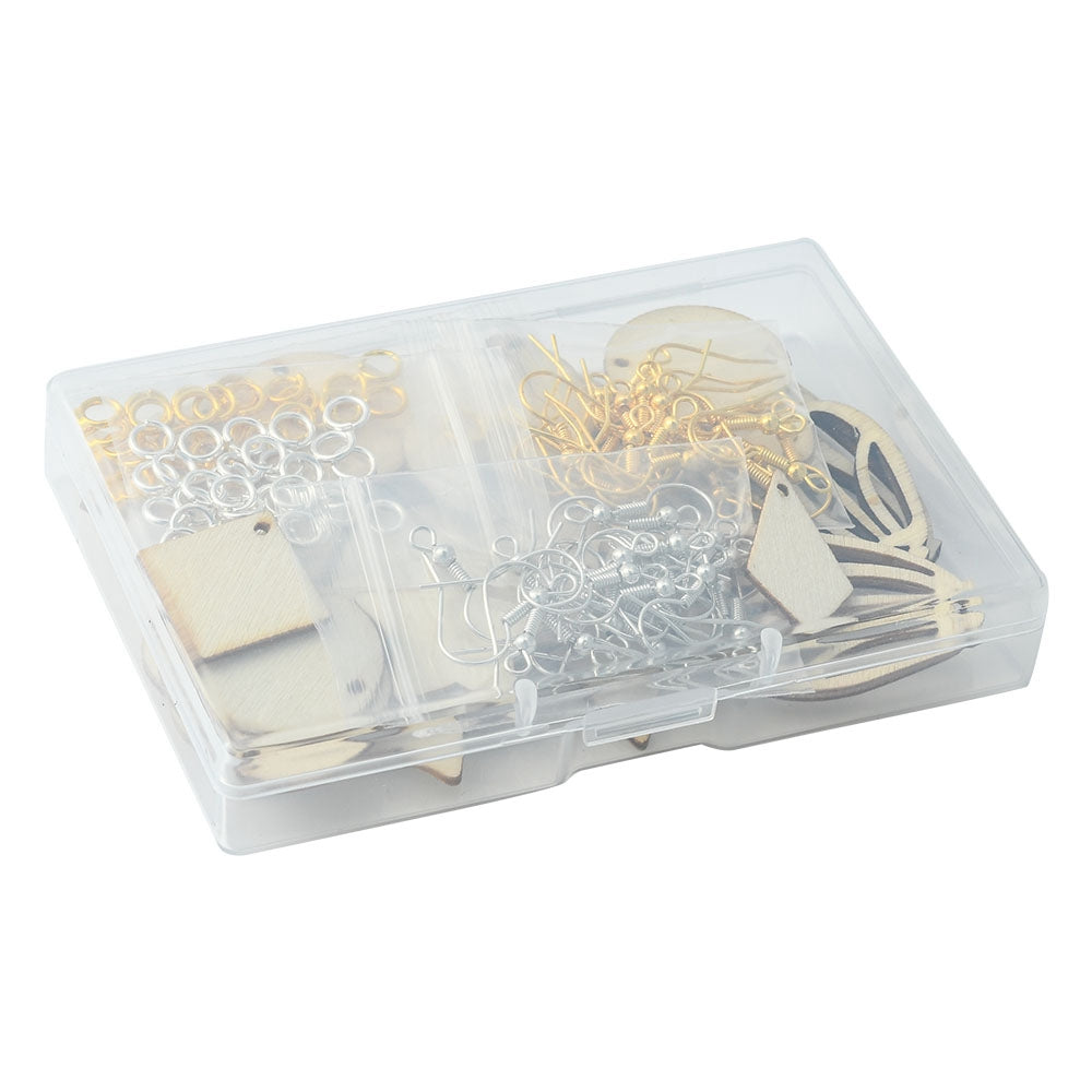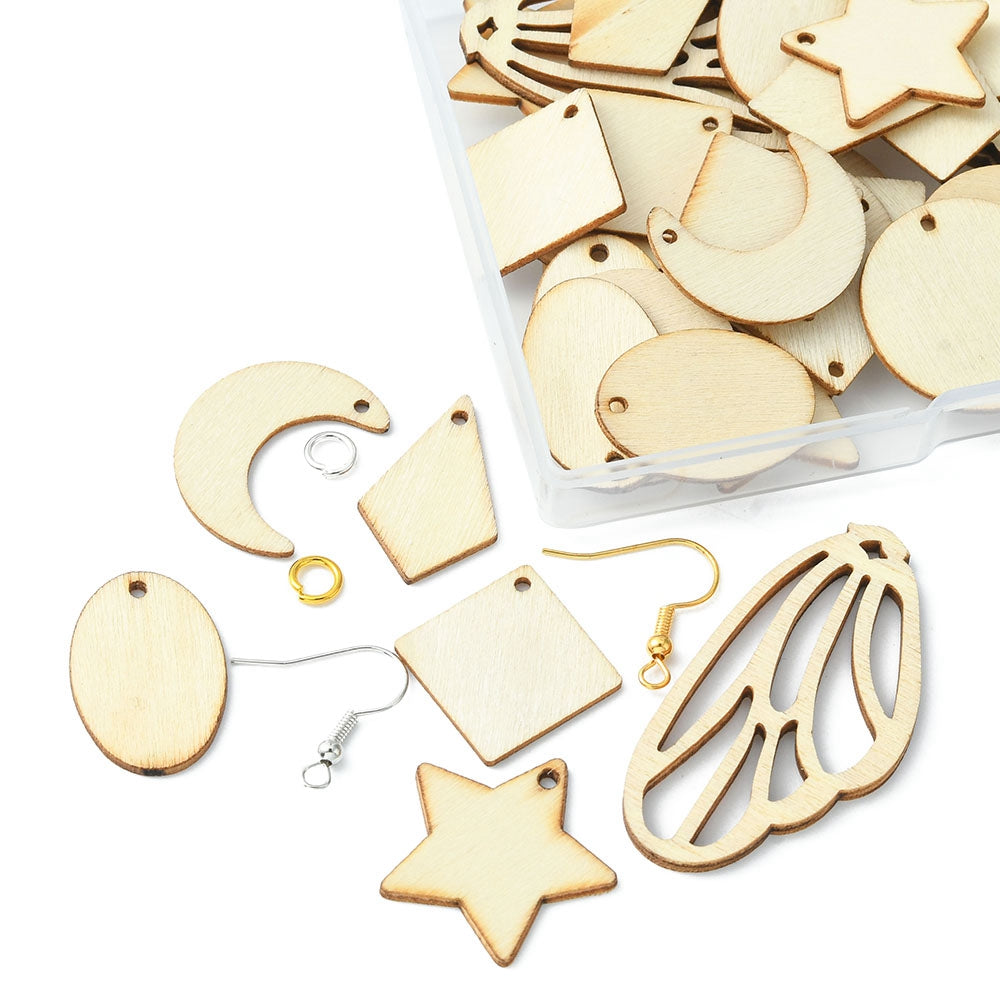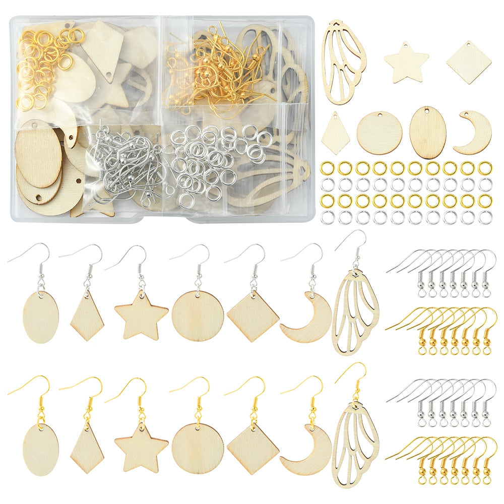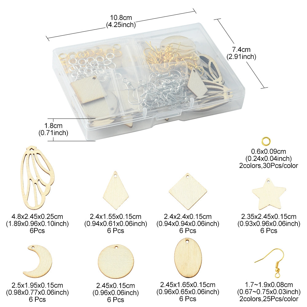 DIY Blank Earring Making Kit, Including Moon & Star & Kite & Leaf Natural Poplar Wood Pendants, Iron Earring Hooks, Platinum & Golden, 152Pcs/box
