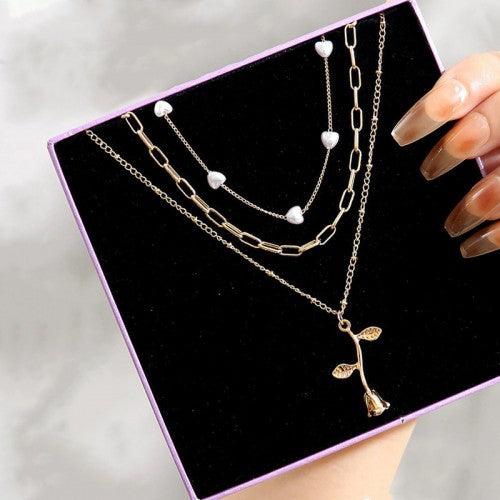 HomeWhite Golden Plated Heart Pearl Chain Necklace With Rose Pendant