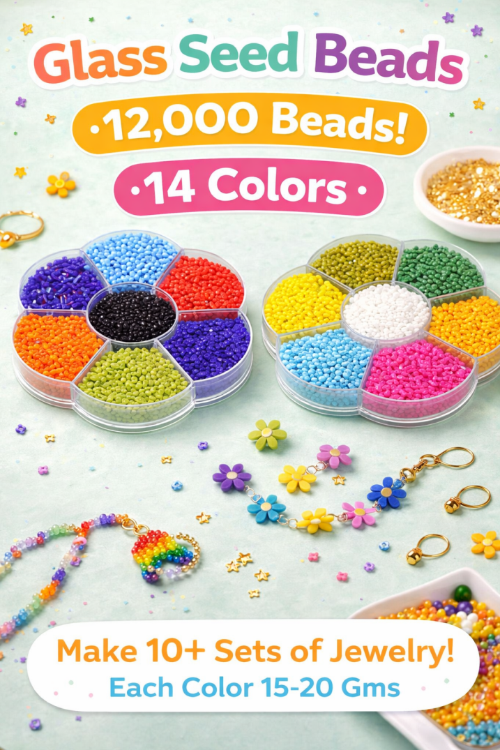 12000 beads in 14 colors of Seed Beads in assorted shapes enough to make minimum 10 sets of Jewellery. Size: 11/0 tiny glass seed beads about 2 mm thick (16-20 beads/Inch) with 0.75 mm hole. Each Color 15-20 Gms Note: The color tone of products you see on your mobile / computer screen may vary from actual product due to lighting effects, monitor's brightness / contrast settings etc.