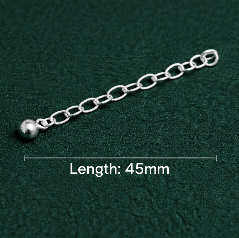 Sterling Silver chain extenders, each piece is 55mm in length with a soldered loop on one side and a ball drop on the other. Ideally used as safety chains on bracelets or for length extenders on bracelets and necklaces.